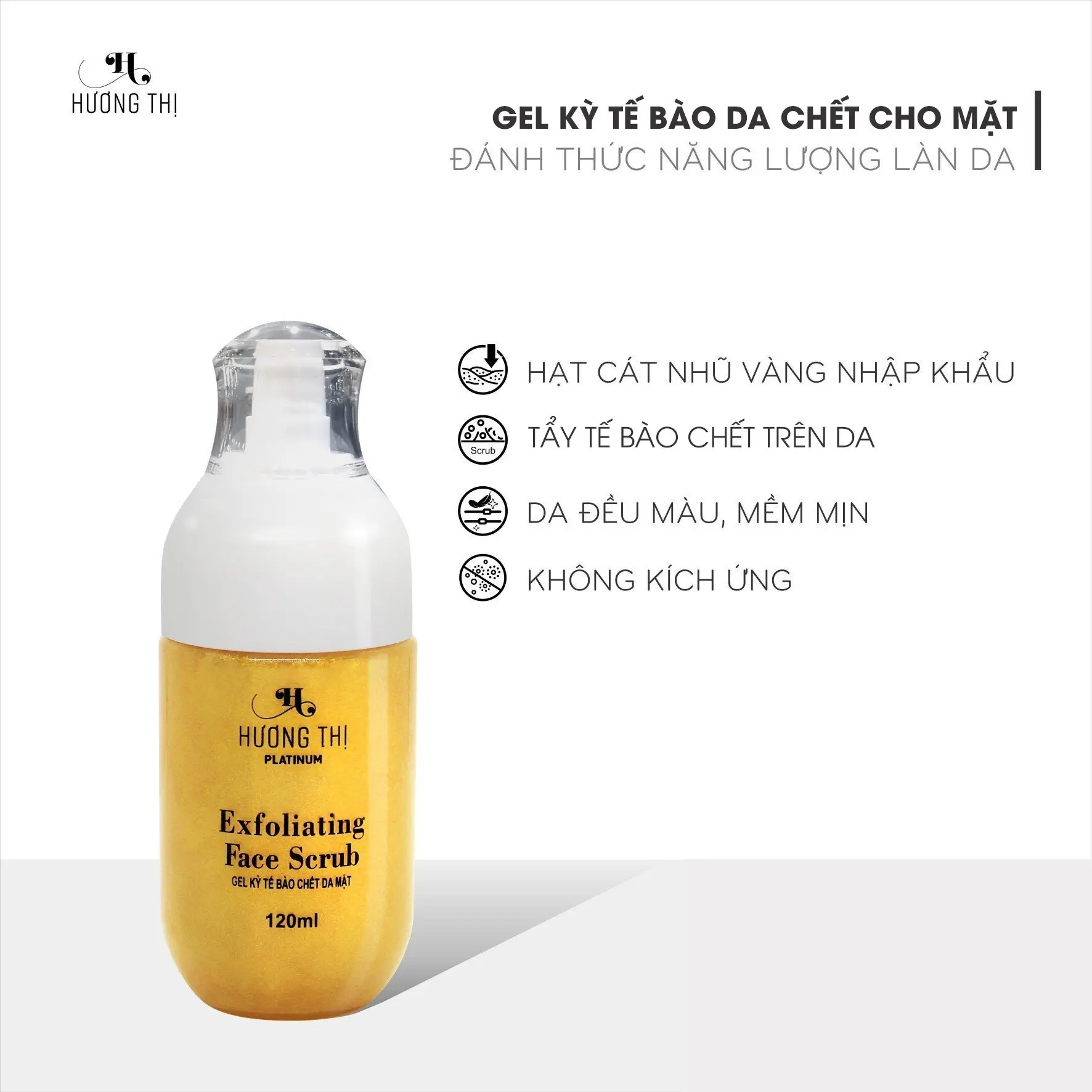 Exfoliating Face Scrub – Gel Kỳ Tế Bào Da Chết Cho Mặt Hương Thị Platinum giúp loại bỏ các tế bào da chết già nua, cũ kỹ, tối màu trên da một cách nhẹ nhàng nhờ thành phần chứa các hạt cát nhũ vàng siêu mịn, trả lại một làn da thông thoáng, mịn màng và đều màu như da em bé.