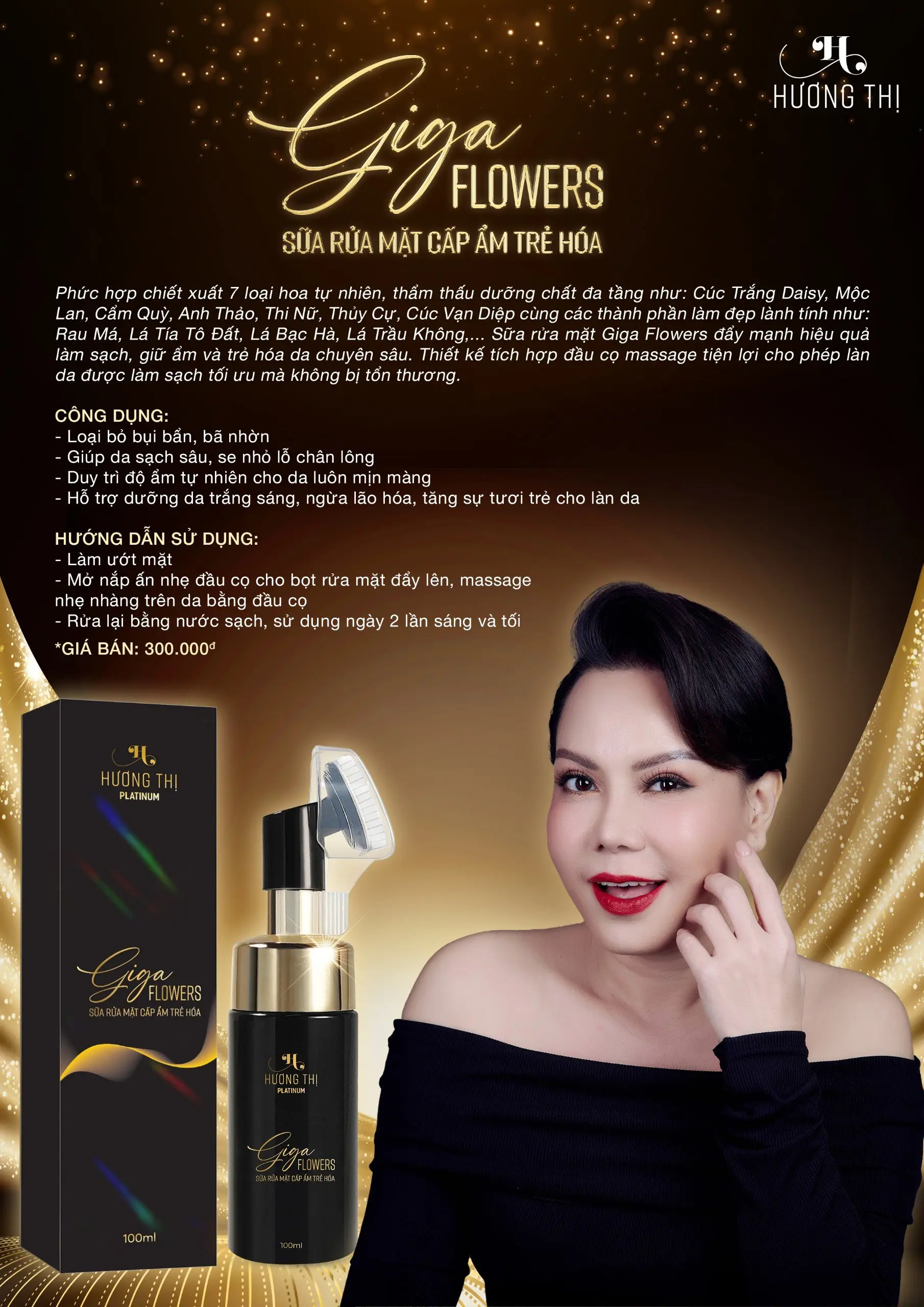 Phức hợp chiết xuất 7 loại hoa tự nhiên, thẩm thấu dưỡng chất đa tầng như: Cúc Trắng Daisy, Mộc Lan, Cẩm Quỳ, Anh Thảo, Thi Nữ, Thủy Cự, Cúc Vạn Diệp cùng các thành phần làm đẹp lành tính như: Rau Má, Lá Tía Tô Đất, Lá Bạc Hà, Lá Trầu Không,… Sữa rửa mặt Giga Flowers đẩy mạnh hiệu quả làm sạch, giữ ẩm và trẻ hóa da chuyên sâu. Thiết kế tích hợp đầu cọ massage tiện lợi cho phép làn da được làm sạch tối ưu mà không bị tổn thương